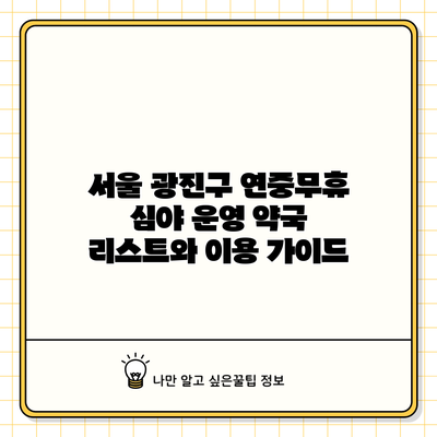 아래 표는 서울시 광진구 내에서 연중무휴로 운영되는 심야 약국 리스트에요. 언제든지 필요한 약을 신속하게 구할 수 있도록, 정확한 위치와 운영 시간 정보를 제공해 드립니다.