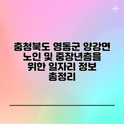 충청북도 영동군 양강면은 노인과 중장년층에게 다양한 일자리 기회를 제공합니다. 시니어클럽과 공공근로 사업은 뛰어난 선택지이며, 지역 민간 기업의 채용 정보도 다양합니다. 이제 여러분은 새로운 일자리를 찾아 활기찬 노후를 설계할 수 있는 기회를 가졌습니다.