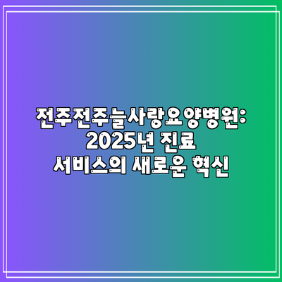전주전주늘사랑요양병원은 2025년에도 환자 개개인에게 맞춤형 치료를 제공하고 있으며, 신뢰를 받을 수 있는 의료 기관으로 계속해서 발전해나가고 있습니다. 다양한 진료 시간과 편리한 예약 시스템, 그리고 재활 프로그램 등을 통해 이 병원은 환자들의 필요를 충족하고 있습니다.